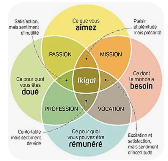 La dimension psychologique et émotionnelle mérite également une attention toute particulière. Cultiver la sérénité, réduire le stress chronique, maintenir des liens sociaux riches et solidaires, trouver un sens profond à l’existence et préserver la joie de vivre constituent des facteurs protecteurs majeurs. Les Okinawaïens parlent de l’« ikigai », une philosophie de vie qui consiste à avoir une raison d’être qui procure naturellement une joie de vivre. Concrètement, l’ikigai consiste à trouver un alignement dans son vécu entre sa passion (ce que l’on aime faire), sa vocation (ce dont le monde a besoin, la contribution), la profession (ce pour quoi on est payé) et la mission (les talents et compétences qu’on met au service du monde). Aligner sa vie pour vivre selon son ikigai permet de se sentir épanoui chaque jour et maintient la vitalité même à un âge très avancé.