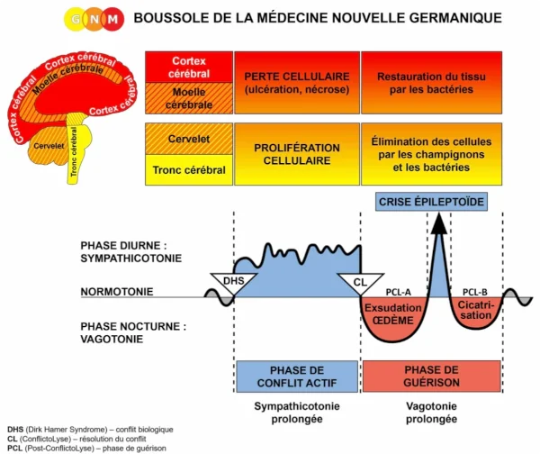 Puis vient la phase de résolution du conflit (ou phase chaude), qui débute dès que le conflit psychologique est résolu. Le système nerveux bascule alors en vagotonie : le système nerveux parasympathique, régulé par le nerf vague, prend le relais pour orchestrer la réparation et la régénération. La personne se détend, retrouve l’appétit et le sommeil, ses extrémités deviennent chaudes par vasodilatation, mais elle peut développer des symptômes inflammatoires, de l’œdème et de la fatigue. C’est durant cette phase de guérison que surviennent souvent les crises les plus spectaculaires, ce que Hamer nomme la « crise épileptoïde », un moment intense au pic de la phase de réparation où le corps rejette les toxines accumulées et consolide la reconstruction tissulaire, avant de revenir progressivement à un état d’équilibre.